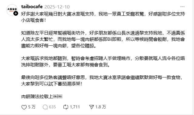 突如其來的生意爆紅,令店主和員工措手不及。據店主女兒朋友透露,店主近日「做到傻(開心嘅)」,要清晨起床準備食材。人手及貨源不足下,店舖甚至建議顧客到對面買白飯配肉餅。這兩天,肉餅飯已經需要限購。