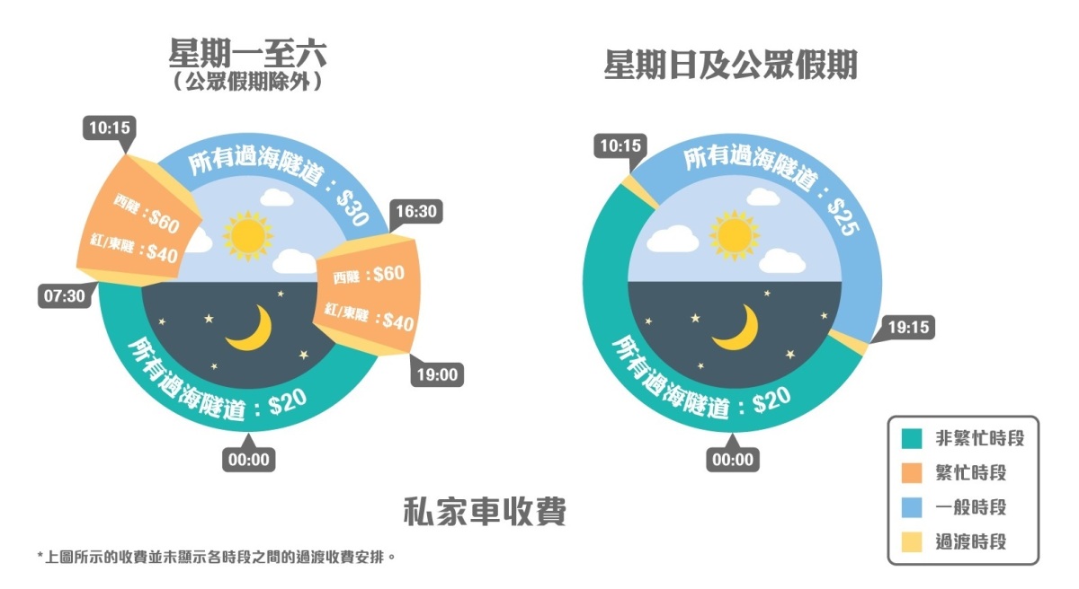 三條過海隧道(即海底隧道、東區海底隧道和西區海底隧道),已於2023年12月17日實施「分時段收費」。