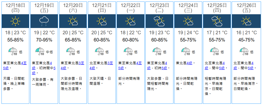 本港近日天氣回暖,天文台指,乾燥的東北季候風正為華南帶來普遍晴朗的天氣。惟一道廣闊雲帶會在未來一兩日逐漸覆蓋廣東沿岸及南海北部,該區有幾陣雨。天文台預計明早(12月18日)市區最低氣溫約18度,新界再低幾度,晚上漸轉多雲。到本周五(12月19日)大致多雲及有一兩陣雨,最高氣溫22度。隨着雲帶轉薄,周末期間沿岸地區天色好轉,到本周六(12月20日)及周日(12月21日)冬至日,日間溫暖,最高氣溫可達25度。