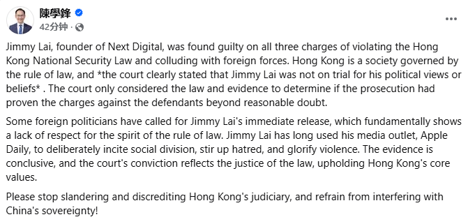 陳學鋒表示,一些外國政客要求特區政府「立即放人」,從根本上對法治精神缺乏尊重。黎智英長期利用其媒體平台《蘋果日報》煽動顛覆分裂國家、激起仇恨、美化暴力,其罪行證據確鑿。法庭的定罪判決彰顯了法律的正義,維護了香港的核心價值。