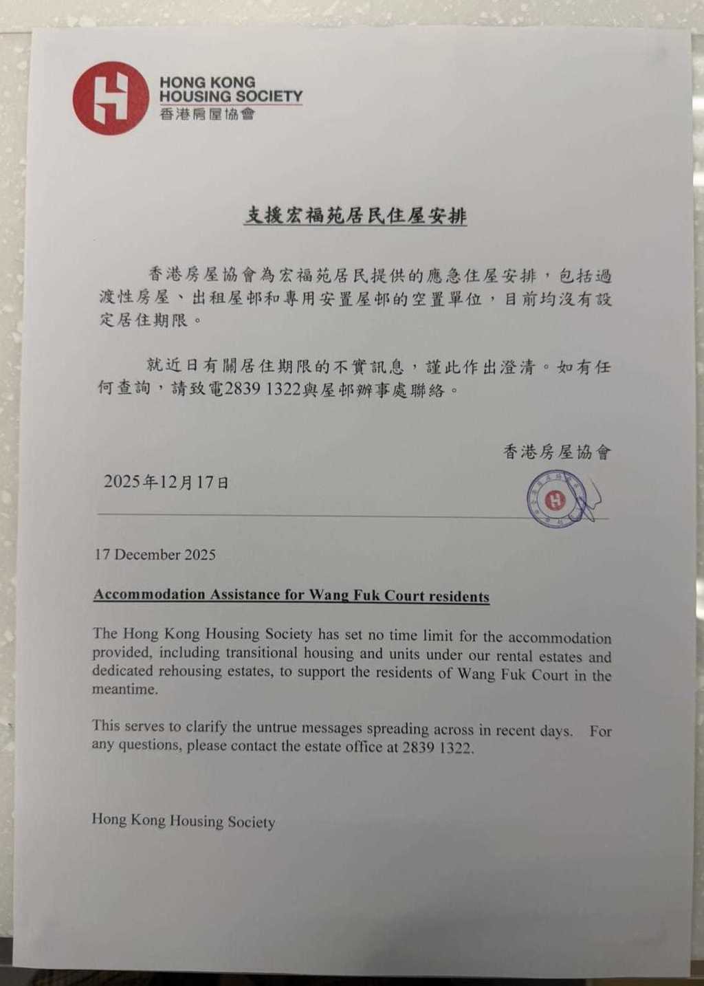 公告指,香港房屋協會為宏福苑居民提供的應急住屋安排,包括過渡性房屋、出租屋邨和專用安置屋邨的空置單位,目前均沒有設定居住期限。公告特別強調,房協就近日有關居住期限的不實訊息作出澄清,並提醒居民若有任何查詢可致電2839 1322與屋邨辦事處聯絡。
