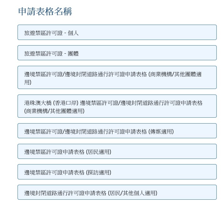 據了解,目前平台涵蓋的申請表格包括旅遊禁區許可證(個人)、旅遊禁區許可證(團體)等,無論要到邊境禁區旅遊、工作、採訪、探親或其他原因,都可以利用系統,更方便、更快捷地提交申請。