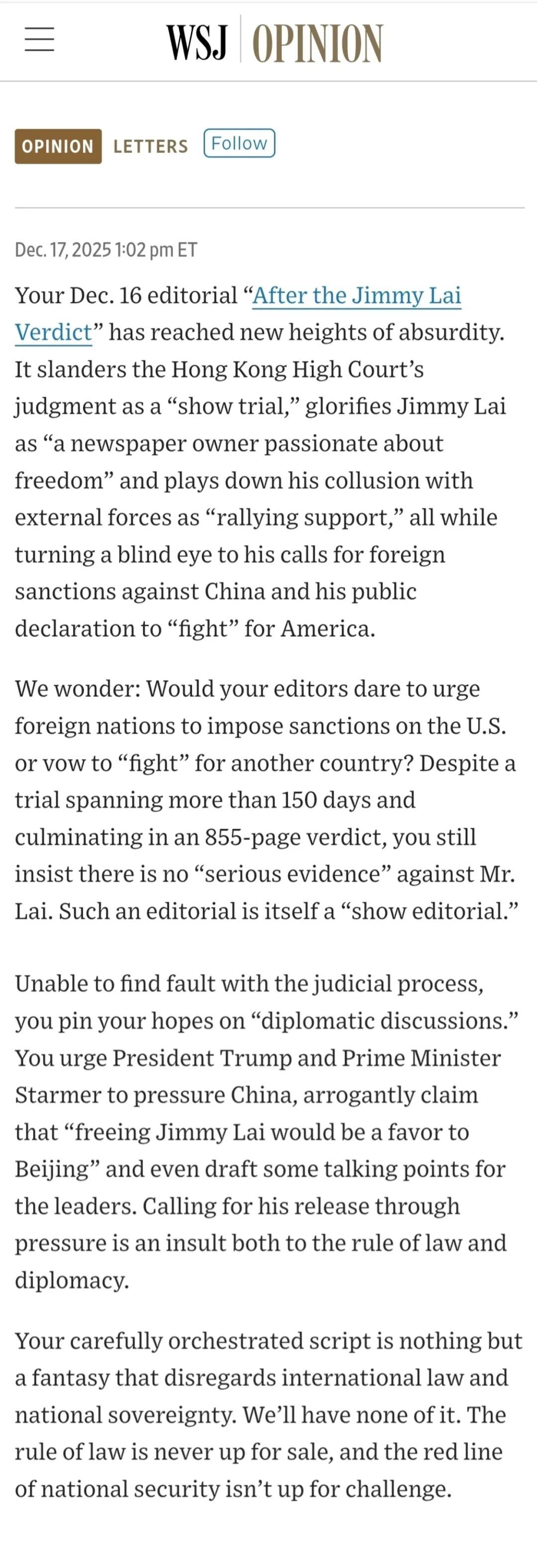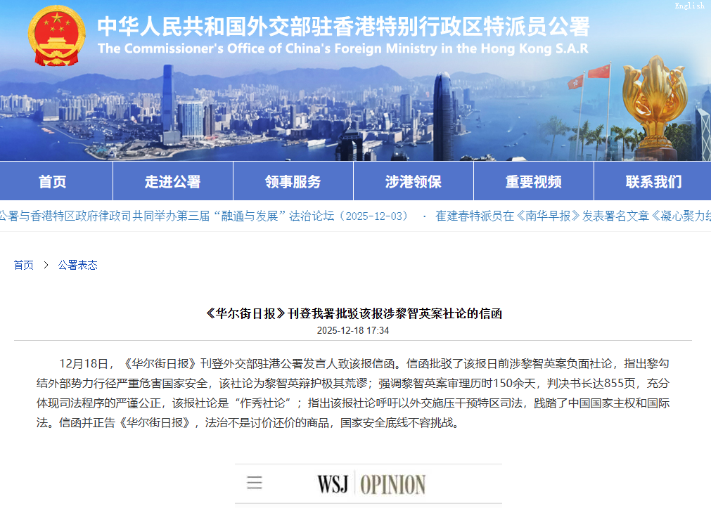 【點新聞報道】12月18日,《華爾街日報》刊登外交部駐港公署發言人致該報信函。信函批駁了該報日前涉黎智英案負面社論,指出黎勾結外部勢力行徑嚴重危害國家安全,該社論為黎智英辯護極其荒謬;強調黎智英案審理歷時150餘天,判決書長達855頁,充分體現司法程序的嚴謹公正,該報社論是「作秀社論」;指出該報社論呼籲以外交施壓干預特區司法,踐踏了中國國家主權和國際法。信函並正告《華爾街日報》,法治不是討價還價的商品,國家安全底線不容挑戰。