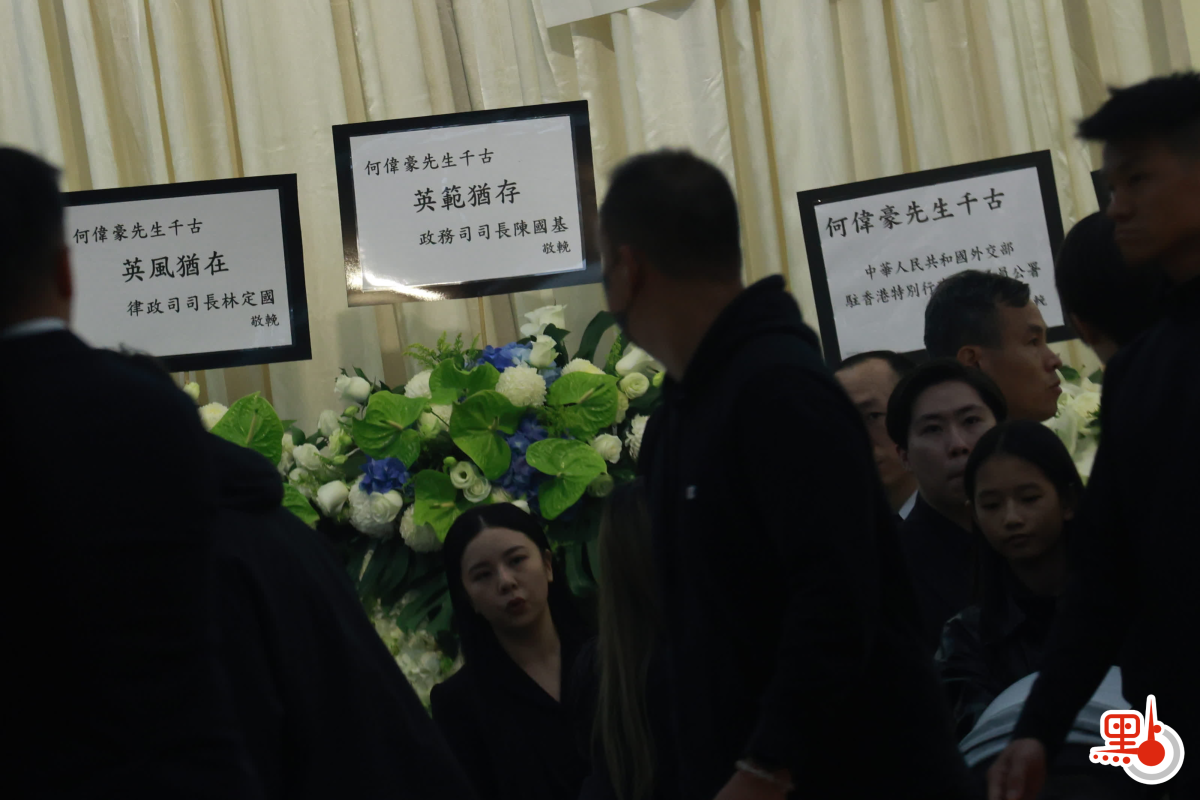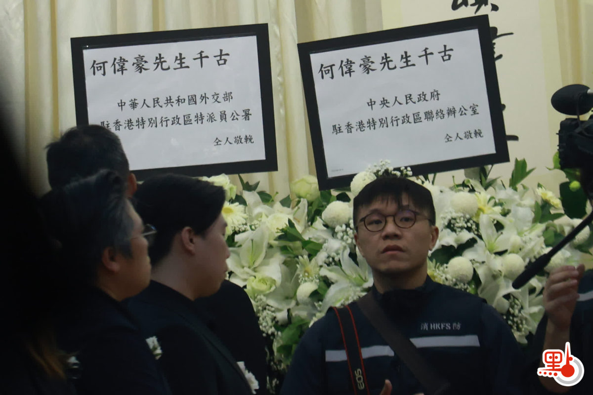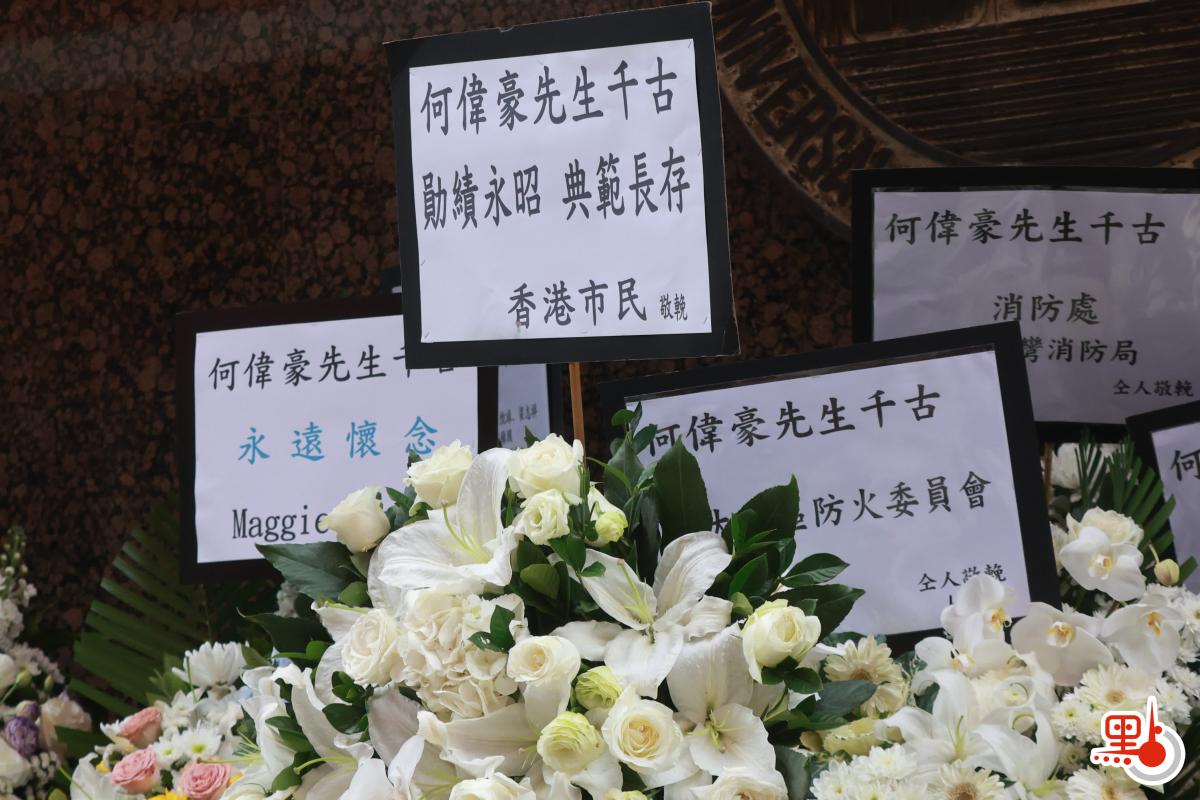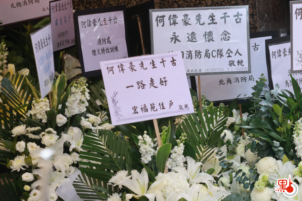 靈堂中央掛有何偉豪穿上消防制服的遺照,橫匾寫上「浩氣長存」四字,堂內外擺放各界致送的花牌,包括政務司司長陳國基、律政司司長林定國等。不少大埔街坊亦送上心意,有宏福苑住戶留言「一路走好」。