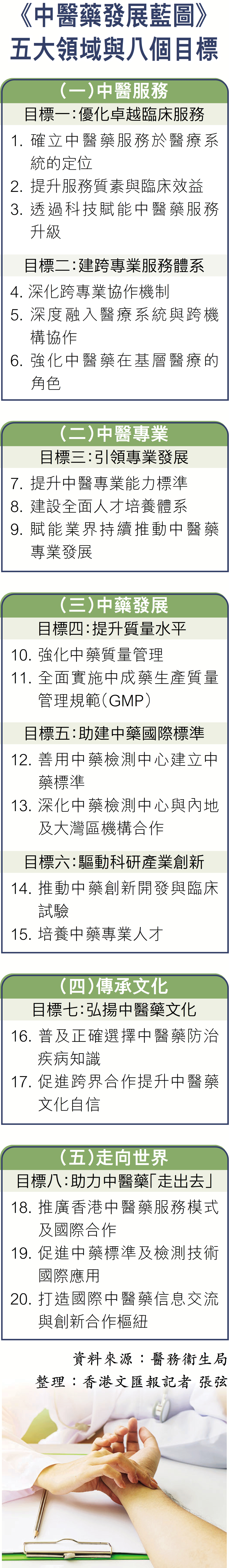 中醫藥是中華文明的瑰寶,新冠疫情期間中醫藥就發揮顯著作用。為推動中醫藥發展,特區政府醫務衞生局昨日(18日)公布香港首份《中醫藥發展藍圖》,提出涵蓋5大領域、8個目標及20個行動的願景,推動中醫藥全方位、高質量及高水平發展,當中包括強化中藥質量管理。香港文匯報早前深入揭露坊間仿冒中成藥(俗稱「影射藥」),《藍圖》着墨甚多,提出將會從成分及藥名等方面入手,並透過修例擴大中成藥定義,將有機會誤導的產品納入規管。同時,政府將有序地將中醫專科化,以及發揮香港「背靠祖國、聯通世界」的獨特優勢,助力國家推動中醫藥走向世界。