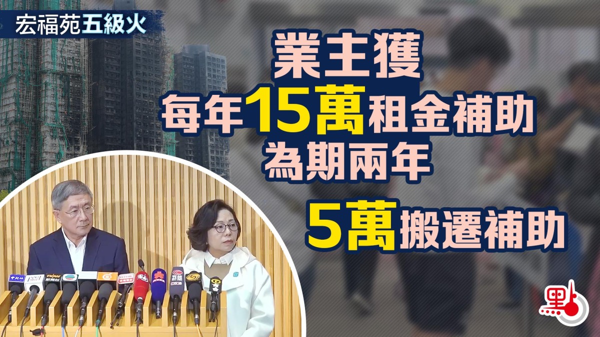 【點新聞報道】政府宣布「大埔宏福苑援助基金」推出兩項新措施,支援受火災影響的居民。第一項是向受影響的業主發放每年15萬元的租金補助和一次性5萬元的搬遷補助;第二項是向受影響的租戶發放一次性5萬元的搬遷補助。