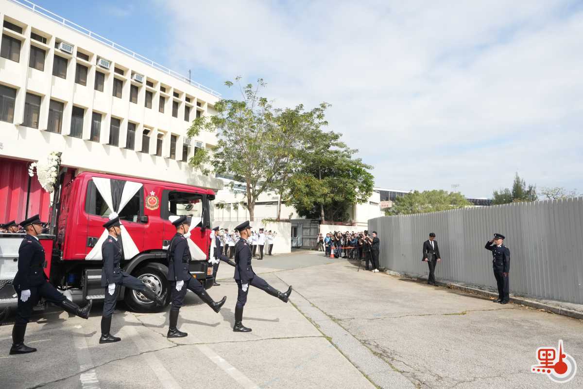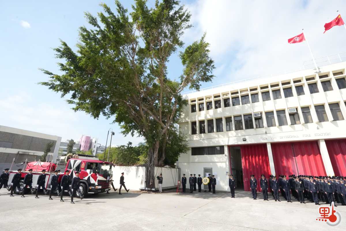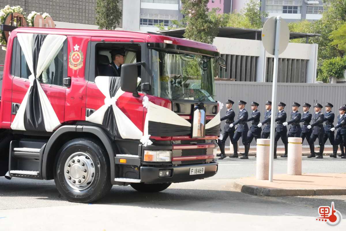 點新聞記者中午12時許看到,靈車到達沙田消防局,消防處處長楊恩健帶領消防人員列隊致最後敬禮。靈柩之後將移送浩園安葬。