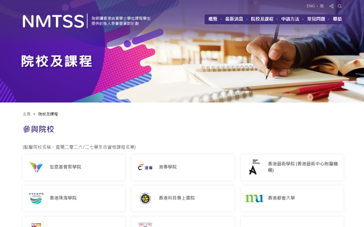 就讀計劃涵蓋課程的所有合資格學生,均可獲資助。申請資助事宜須透過有關院校辦理。適用於2026/27學年的15所合資格院校及課程名單點此查看。該名單會因應院校提供的最新資訊而更新,如欲查閱合資格課程的最新詳情,請瀏覽專屬網頁。