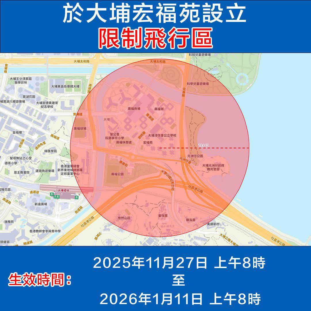 【點新聞報道】警方表示,鑒於公眾安全,警務處在大埔宏福苑範圍已設立「限制飛行區」。時間將會由2025年12月28日上午8時延長至2026年1月11日上午8時。