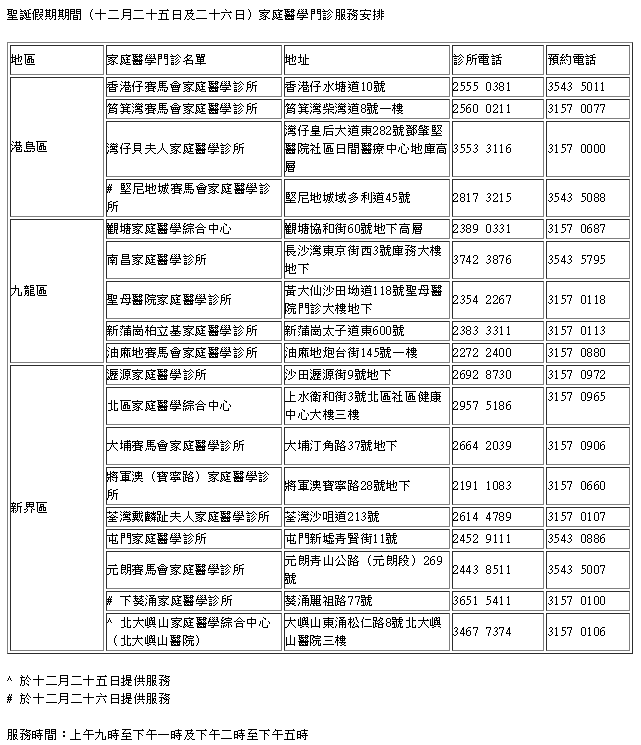 聖誕假期期間(12月25日及26日),將有18間家庭醫學診所提供公眾假期家庭醫學門診服務。求診人士可透過電話預約系統或「HA Go」流動應用程式內的「預約家庭醫學診所」功能,預約診症時間。