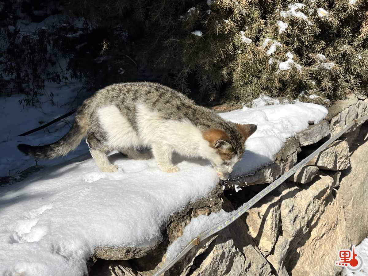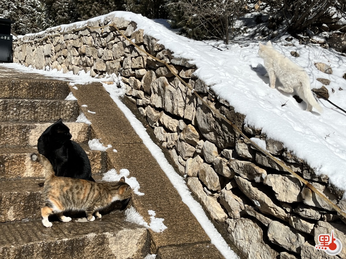 索道因天冷停運,我只能徒步盤旋上山,反而給了我細細欣賞恒山雪景的機會:雪地裏有細碎的爪印,應是野貓留下的。果不其然,不遠處傳來窸窣聲響,幾隻小貓蜷縮在枝葉間,簌簌發抖地覓食。我摸摸空蕩蕩的腰包,懊惱身上裏沒有帶上任何零食。再往前,一個從樹梢掉落的鳥巢躺在雪中,空空如也,不知那些雛鳥可還平安?