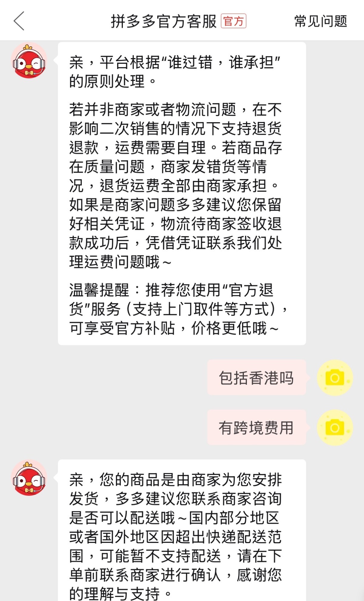 也有網民自述申請退貨時與商家協商無果,最終靠撥打內地消費者投訴電話12315才得以解決。對此,記者再次向拼多多查詢,是否其此前提到的「商家發錯貨全額承擔退貨運費」原則,不包括香港?客服回覆稱,商品是由商家安排發貨,平台建議聯繫商家諮詢是否可以配送及承擔運費,亦提到國內部分地區或國外地區因超出配送範圍,可能暫不支持配送,需要聯繫商家確認。由此可見,拼多多平台對運費規則、商家處理情況都較為模糊。而想要有效解決有關糾紛,平台在出台處理原則的同時,亦需要在商家與消費者溝通不暢時及時介入,監管商家遵守相關原則。