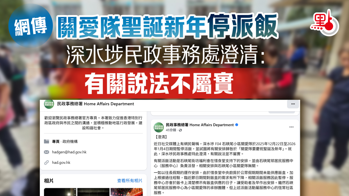 【點新聞報道】民政事務總署今日(20日)在社交專頁表示,近日有網民聲稱深水埗石硤尾小區關愛隊於12月22日至明年1月4日期間暫停派飯,並試圖將有關安排歸咎於「關愛隊要慶祝聖誕及新年」,深水埗民政事務處澄清,指有關說法並不屬實。