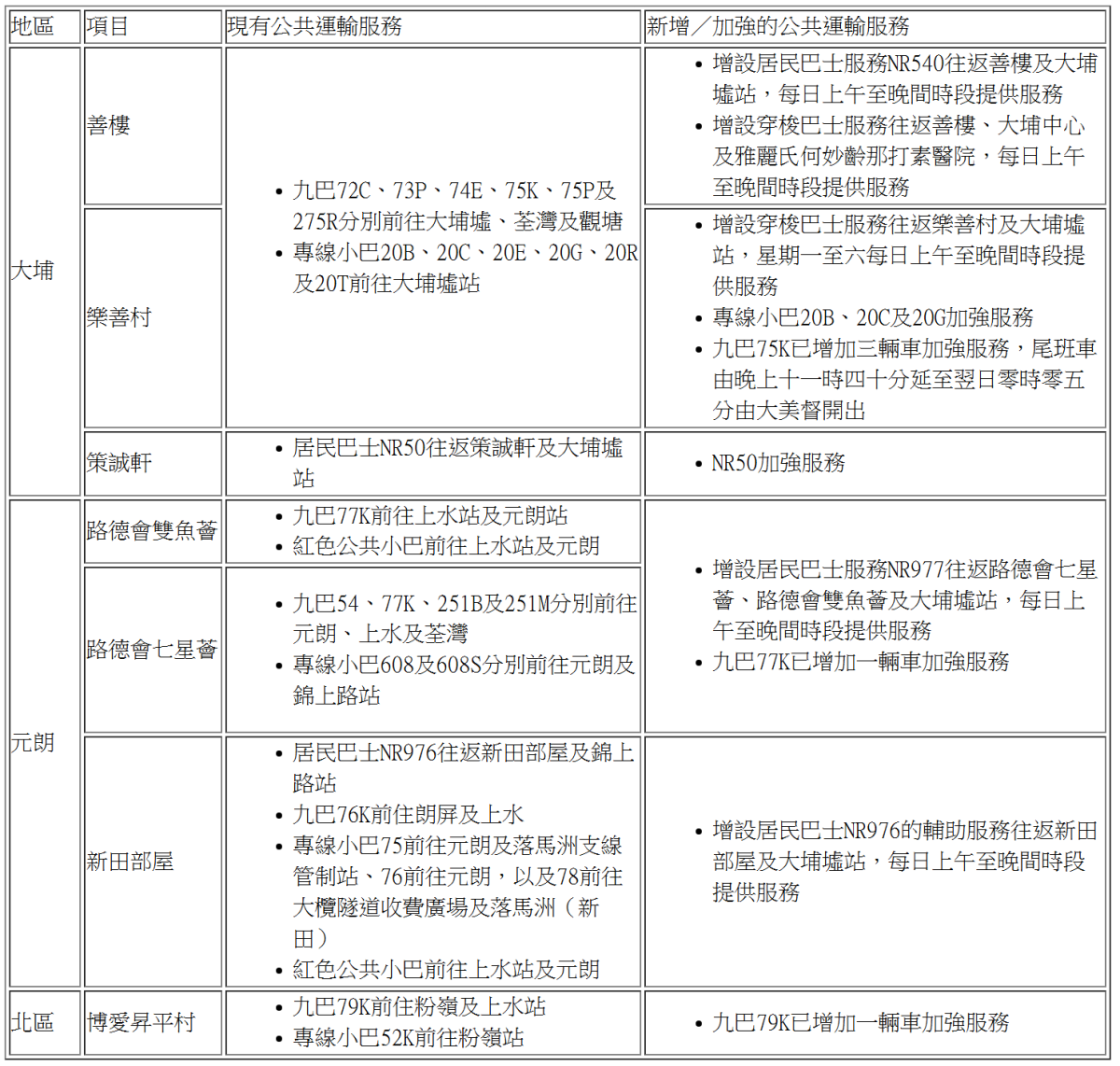 其中,元朗「路德會七星薈」和「路德會雙魚薈」將增設居民巴士服務往返大埔墟站。至今各過渡性房屋項目的公共運輸服務表列如下: