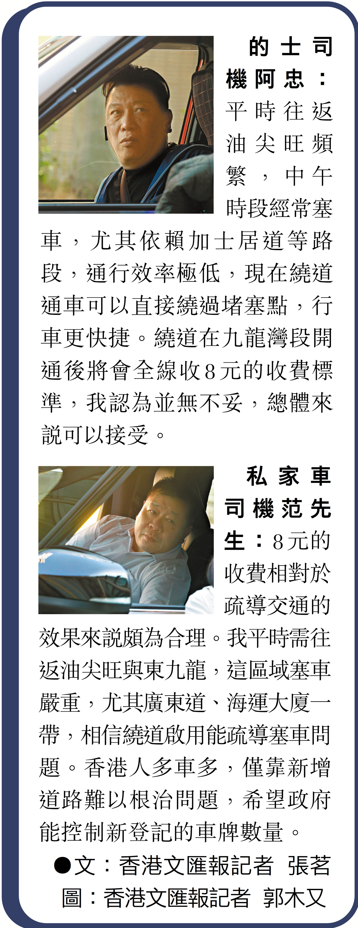為體驗繞道帶來的暢通感受,黃永威昨日駕車載香港文匯報記者及陳少棠進行實測。黃永威介紹,以往由九龍西往九龍東必須途經經常塞車的加士居道,常因「三線併二線、二線併一線」而出現擁堵車流場面。他說:「現時有繞道,去觀塘、將軍澳方向的車輛無需經油尖旺、柯士甸道這些繁忙路段。」他形容,繞道就像是「九龍東西的捷徑」,不僅方便跨區出行,更間接改善加士居道、尖沙咀等傳統堵點的交通狀況。