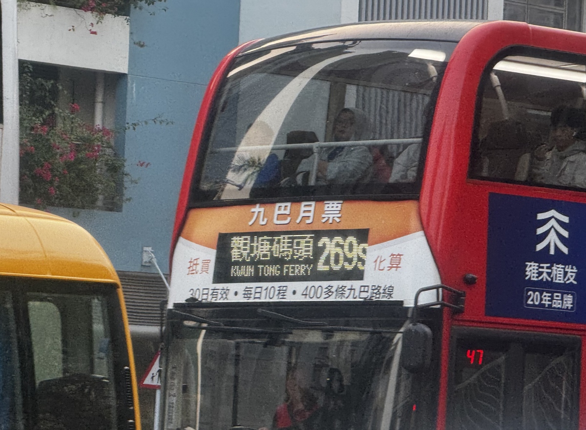 今日起,往返新界天水圍和東九龍觀塘的269S線,來回方向均改經西九龍公路及中九龍繞道,不再途經呈祥道及龍翔道。往觀塘碼頭方向增停啟祥道「啟隧轉車站-啟成街」及宏光道「臨華街遊樂場」站,同時取消停靠龍翔道「黃大仙轉車站-沙田坳道」及宏照道「九龍灣臨華街」站。