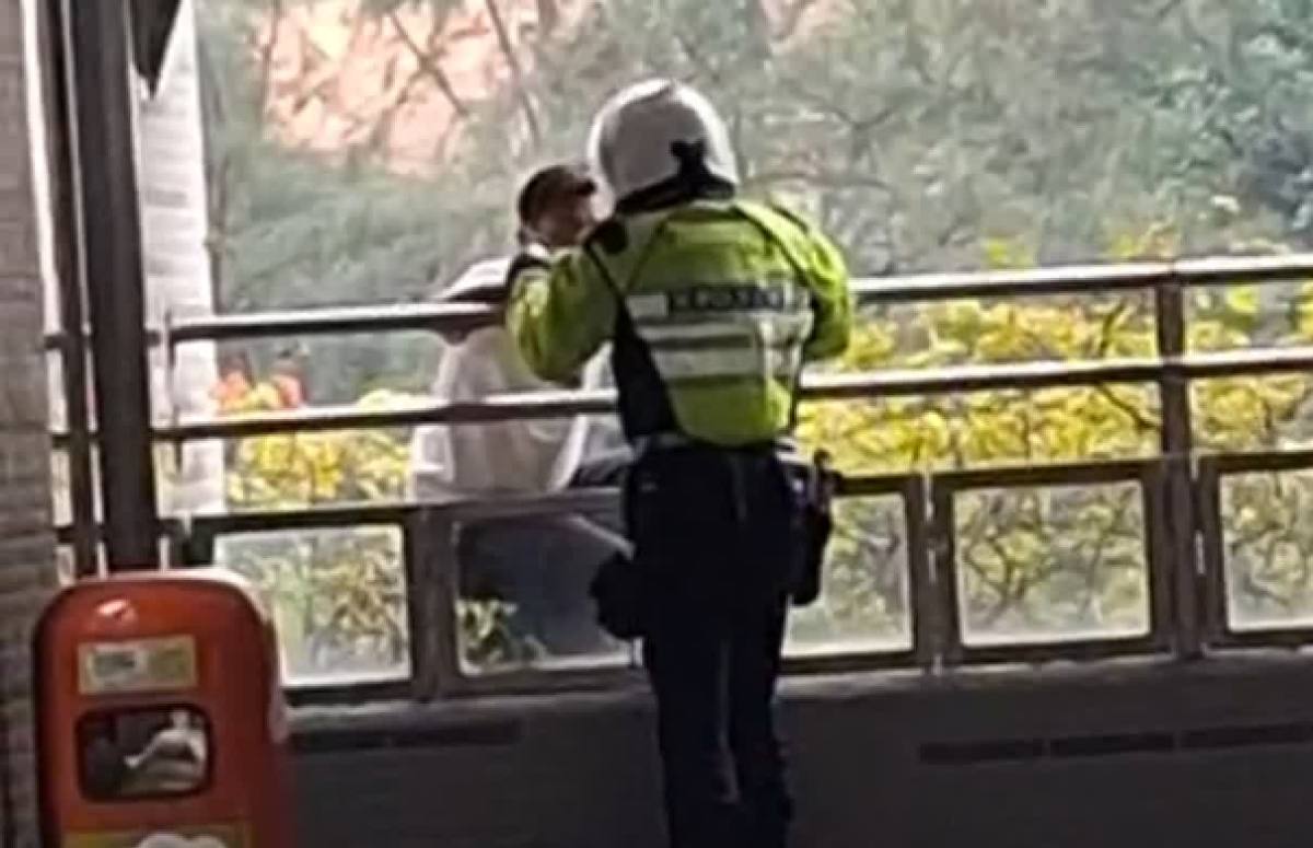 【點新聞報道】九龍塘今早(22日)上演馬路追逐戰。網上瘋傳一段車Cam短片,片中可見一輛本田私家車在窩打老道南行線衝出太子道西,並逆線駛入另一邊窩打老道南行逃去,一輛警方電單車尾隨響號追捕。另有片段顯示,一名男子爬出行人天橋欄杆外,一名戴頭盔警員大聲勸止「落嚟先講、落嚟先講……落嚟畀個機會你……」。