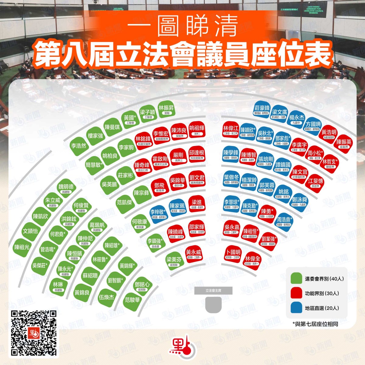 【點新聞報道】香港特區第八屆立法會選舉圓滿結束,新一屆立法會90個議席「大執位」,當選議員近半屬「新丁」。第八屆立法會議員座位表顯示,連任的50名議員中,只有逾20人座位未變,各政黨佔據的「地盤」則未有明顯變動,40名選委會界別議員照舊由主席左側坐至中間,各大政黨按照界別「坐埋一齊」,不過有個別議員的座位耐人尋味。
