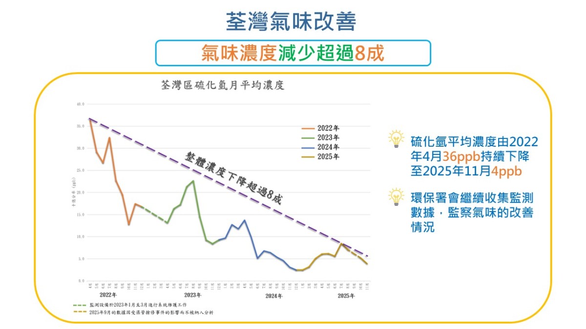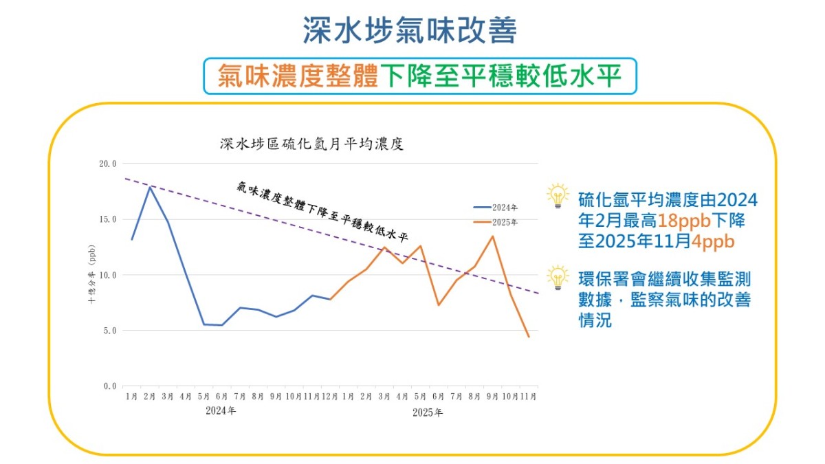環保署指,過去3年積極運用創新科技,致力偵測及糾正污水渠錯駁,以改善維港沿岸地區的氣味問題。截至今年第三季,環保署團隊已在荃灣、葵青及深水埗區共檢查超過5000個沙井,化驗逾1200個水樣本,共識別191宗污染個案,估計污染量相當於約30萬人口。經跨部門合作,當中荃灣、葵青及深水埗區的排水口總污染量已減少近九成,近岸氣味已得到大幅改善。設置在荃灣及深水埗海濱的氣味監測儀器,顯示硫化氫平均濃度由過往分別36 ppb及18 ppb減到現今均低於5 ppb。