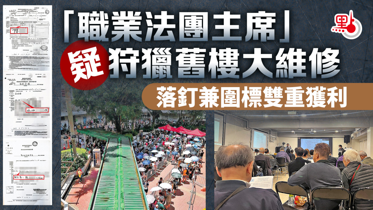 【點新聞報道】全港舊樓維修每年工程費高達數百億元,吸引圍標集團垂涎,業主立案法團本應是當中的「防火牆」,確保工程招標透明、清廉、高效。不過,香港文匯報經數月深入多個舊樓立案法團會議,直擊小業主聲音不被法團正視,更發現疑似「職業法團主席」頻頻擔任多幢大廈法團主席,意圖可疑。一名工程界「吹哨人」踢爆圍標常用套路,記者並邀請多名專家集思廣益,為特區政府獨立委員會獻計堵塞目前的漏洞,將一連四輯報道。