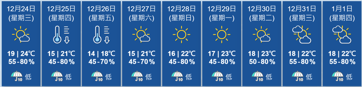 根據天氣預報,一股季候風補充會在聖誕節(25日)早上抵達華南沿岸,預料聖誕節本港轉吹北風,天氣轉涼,稍後氣溫下降至翌日(26日)最低約14度,其後逐步回升,到除夕(31日)料市區氣溫最低18度,即未來9日需發出寒冷天氣警告的可能性較低,可能打破2007年最遲發出紀錄,當年12月30日才發出首次寒冷天氣警告。