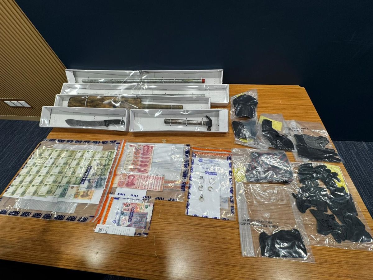 【點新聞報道】警方於昨日(22日)凌晨接報,報案人指其位於八鄉的村屋遭數名陌生男子爆竊,其中3名男子手持武器,包括鐵通、木棍及牛肉刀。新界北總區衝鋒隊接報後迅速趕到現場,在距離案發地址50米外發現一架可疑七人車輛,衝鋒隊人員隨即上前截停並搜查該車輛,並在車內成功搜獲犯案時的相關武器以及失物,包括總值大約22000港元的現金及珠寶首飾。警方隨後以「嚴重入屋犯法罪」拘捕車上一行7名非華裔男子,年齡介乎17至36歲,其中2名被捕人持有香港身份證,而另外5名為持有擔保書(俗稱行街紙)。