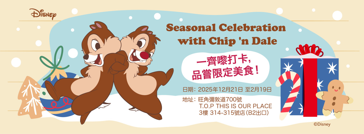 今年冬季,調皮可愛的「Chip 'n' Dale」換上新裝亮相旺角山下菓子「Seasonal Celebration with Chip 'n' Dale」期間限定店。活動貫穿12月21日至明年2月19日,從森林採果、烘焙甜點,到換上紅金賀年裝飾,這對「人氣拍檔」將呈現雙節限定場景、30+款節日限定餐點與多款收藏紀念品及商品,帶領粉絲走進一段甜蜜又充滿儀式感的節慶旅程。