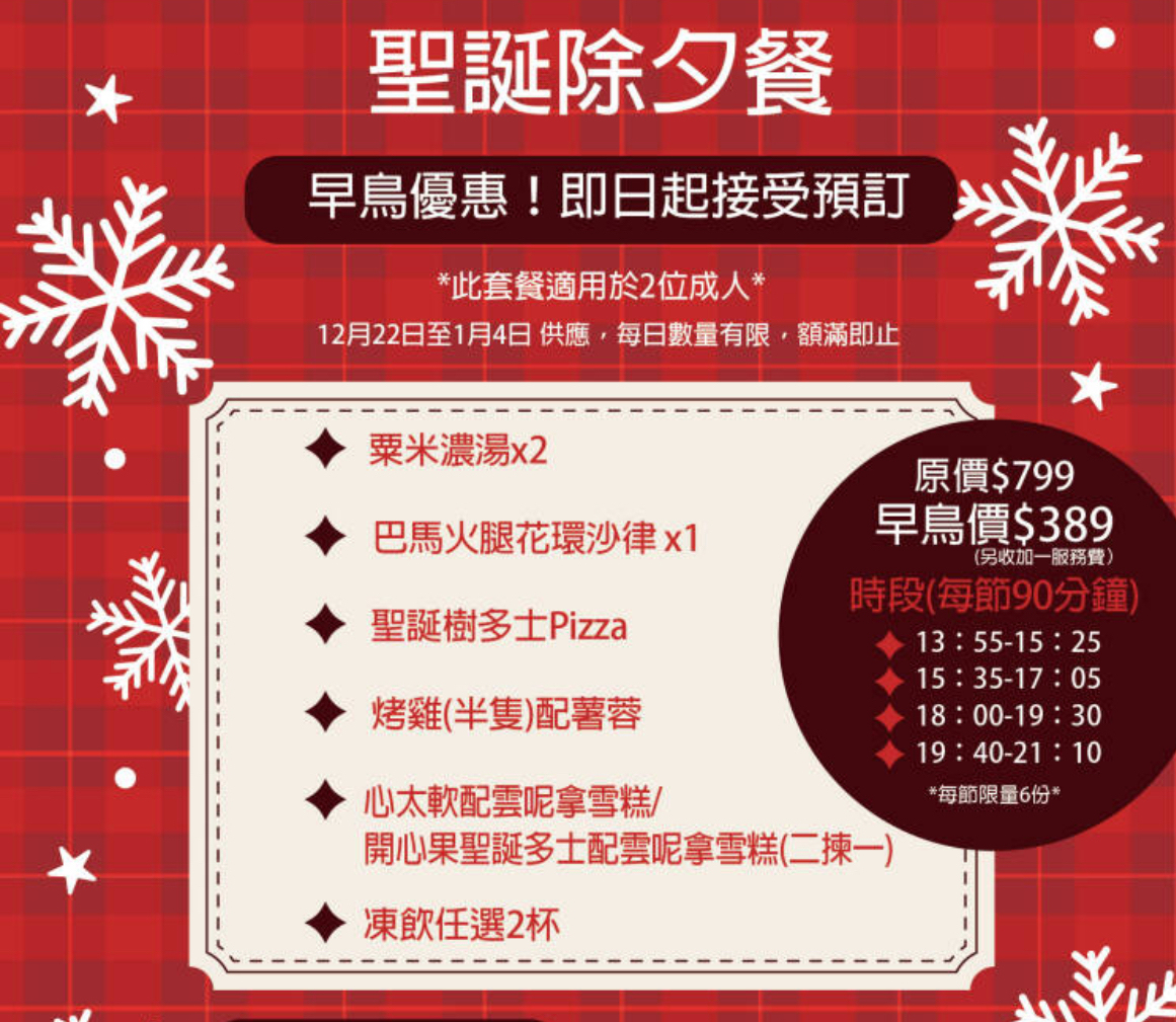 【點新聞報道】明日(24日)就是平安夜,馬上就要迎來萬眾期待的聖誕節!點新聞整理以下過節資訊,一齊過節!「Chip 'n' Dale」期間限定甜品店亮相旺角山下菓子,除多款朱古力/草莓/森林系列甜品與主食外,更推出聖誕及元旦雙節的$389雙人餐,迪士尼粉不要錯過!乳酪品牌卡士亦推出「芒芒椰椰」新口味,$21/3杯嘗鮮優惠;「STEAM UP想建理」學習資源中心推出聖誕免費工作坊,寓教於樂,讓學生與家長共同動手度過有意義的聖誕,更有太空館外牆光影匯演,色彩絢爛!