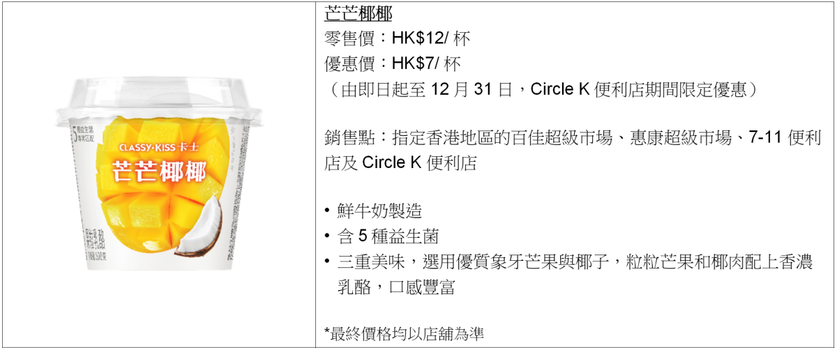 有「乳酪界愛馬仕」之稱的高品質乳酪品牌CLASSY·KISS卡士,自去年進駐香港後大受歡迎。卡士此次特意推出「芒芒椰椰」口味,選用優質芒果與椰子,加上香滑乳酪,以鮮牛奶製造、含5種益生菌,雙重果粒迸發三重美味,大人小朋友都「一啖入魂」,在健康上同樣「贏在起跑線」!Circle K便利店由即日起至12月31日更以優惠價$21/3杯讓大家嘗鮮,健康美味又抵飲,萬勿錯過!