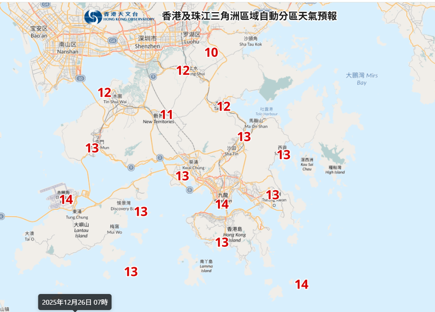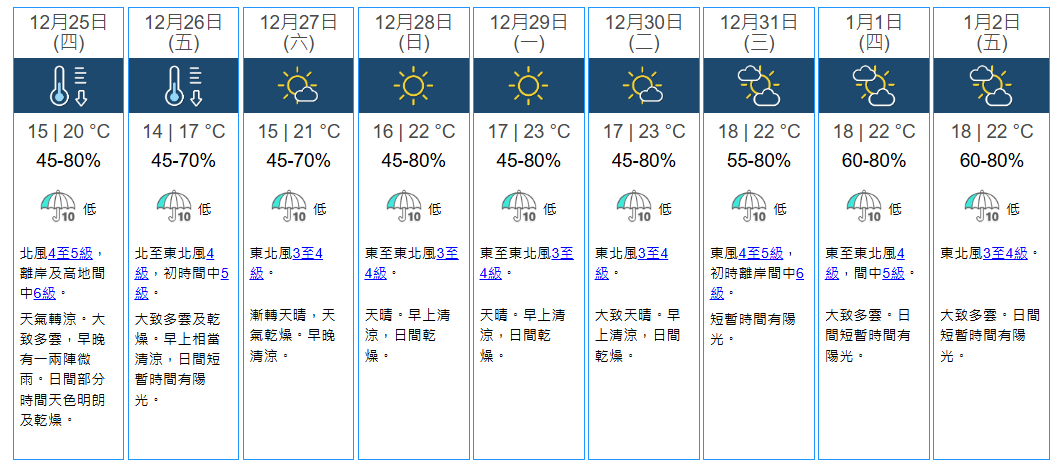 今年聖誕節「先暖後凍」,今天日間氣溫和暖,多區氣溫達20度以上,上水、荃灣、跑馬地等區更錄得25度。惟天文台預料明日(12月25日)北風增強,天氣轉涼,聖誕節翌日(12月26日)市區氣溫進一步下降至最低約14度,新界部分地區寒冷。根據天文台分區天氣預報,Boxing Day早晨清涼,上水、大埔、流浮山、石崗等區只得11至12度,打鼓嶺更凍至10度。而到周末期間天晴,早上仍然清涼,內陸地區日夜溫差較大。