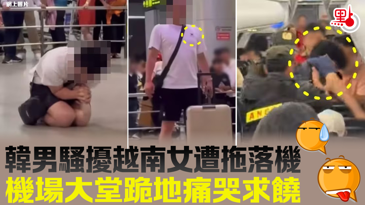 除在飛機上被拍下被拖出座位的一幕,該韓國男子在機場不知所措的畫面亦遭網民拍下,可見他穿着印有韓國國旗的白色上衣,站在入境大堂閘口呆站,並突然雙膝跪地抱頭痛哭。