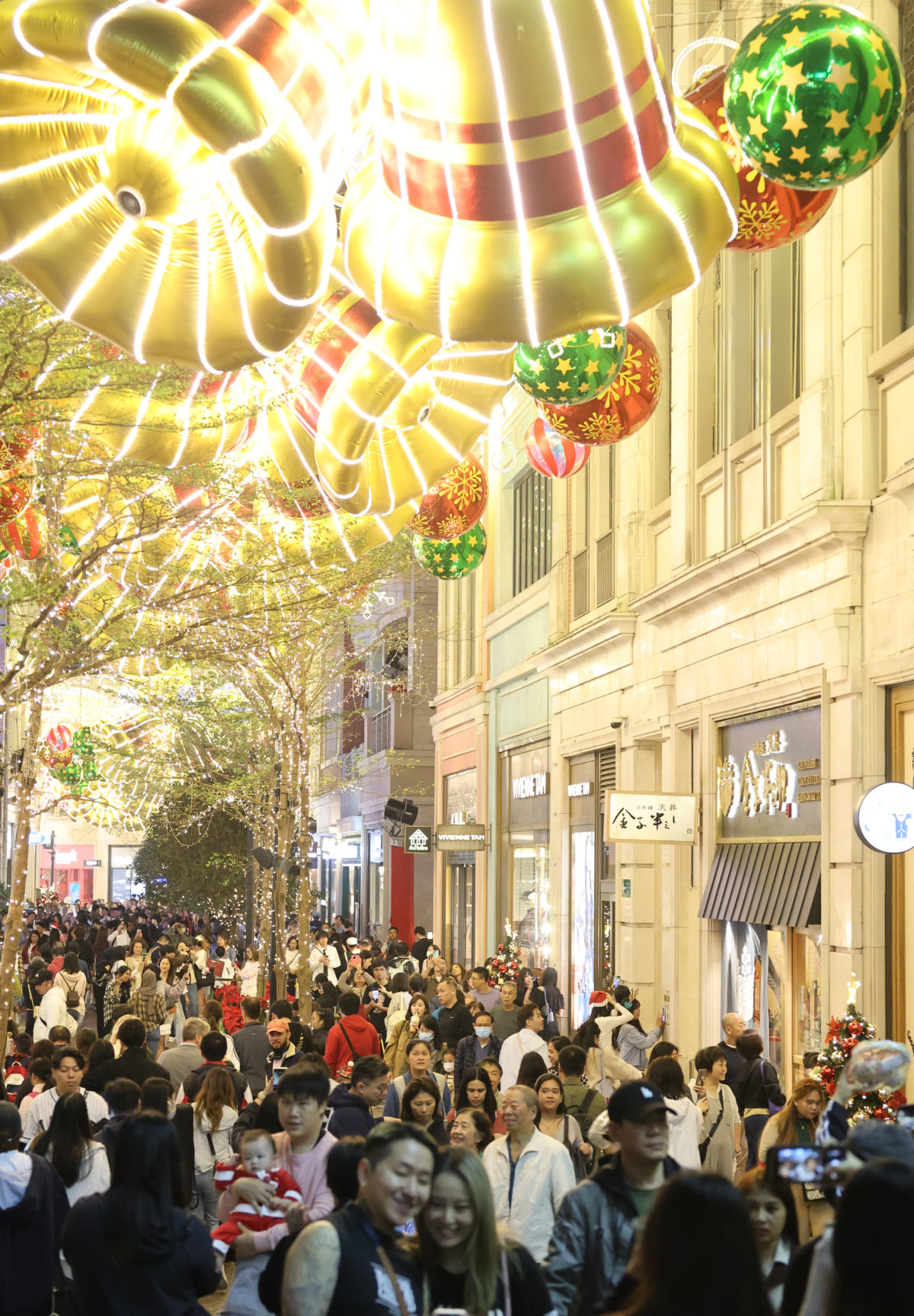 今年燈飾以金色鈴鐺為主題,中庭位置則有巨大聖誕樹供打卡。整條街其實很快就能走完,不妨逛逛聖誕市集等待入夜後的飄雪時刻!