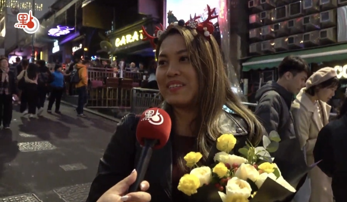在港度過第12個聖誕節的菲律賓籍女士Leean與男友同行逛街,男友特意為她購買了街邊的花束慶祝聖誕,她對此感到非常開心。她表示,相比於她的家鄉,認為香港的聖誕氛圍更令人享受和開心。她的聖誕願望是「快樂生活!」