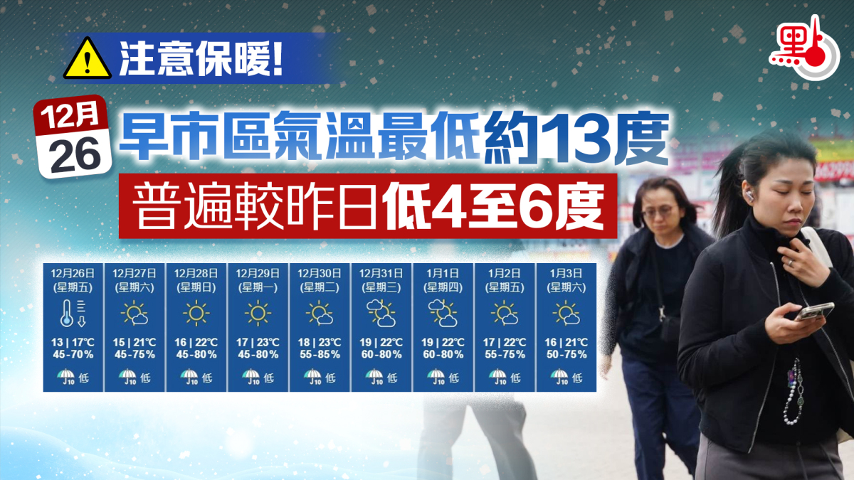 【點新聞報道】受東北季候風影響,本港今日(26日)早上相當清涼,氣溫普遍較昨日低4至6度,市區氣溫最低約13度,新界再低兩三度。天文台發出特別天氣提示,預料明日早晚仍然清涼,提醒市民留意天氣變化,注意保暖,並多關顧長者及慢性病患者。