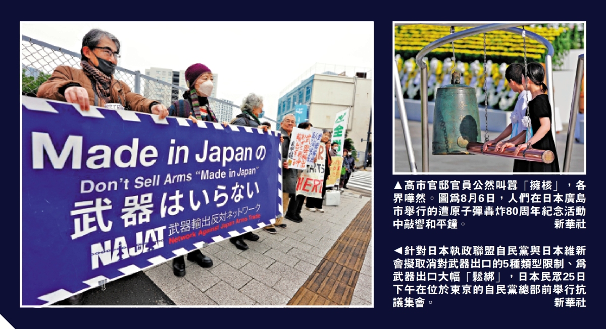 值得一提的是,日本《周刊文春》24日曝光了鼓吹「擁核」日本官員身份。報道稱,日本首相官邸高官此前被曝聲稱「日本應擁核」受多方譴責,消息人士向《周刊文春》透露,發表該言論的是日本首相高市早苗的親信、首相輔佐官─尾上定正,他負責核軍縮、核不擴散事務。