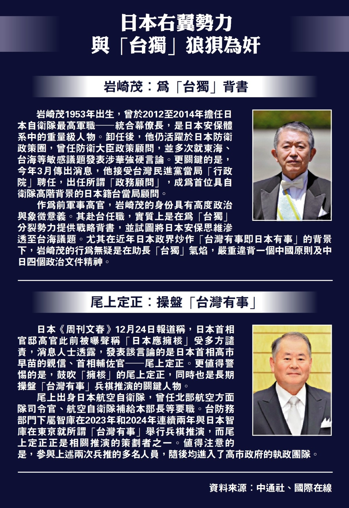 今年3月,岩崎茂竟出任台灣地區所謂「行政院」的政務顧問。更值得警惕的是,根據相關信息透露,他還多次前往台灣地區。今年6月,他曾參與台灣民間智庫組織舉辦的「台海防衛兵推」。這完全不是「顧問建議」,而是實質性的軍事勾連。