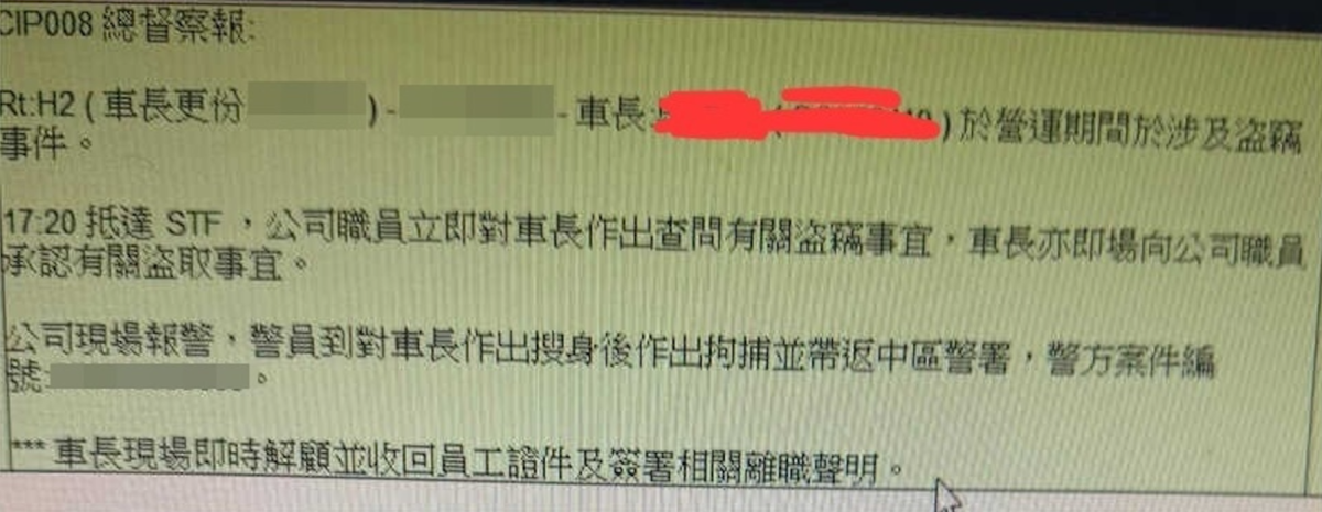 涉事巴士為H2線的雙層開篷觀光巴士,來往尖沙咀至中環碼頭。有網友指,12月23日下午5時20分,觀光巴士抵達中環天星碼頭總站時,城巴公司職員隨即登車向車長進行突擊查問。該名車長在職員質問下,當場承認涉及盜竊行為。公司代表隨即報警處理, 並在現場將該車長解僱,收回其員工證件並簽署離職文件。警方到場搜身後將車長拘捕並帶返中區警署調查。