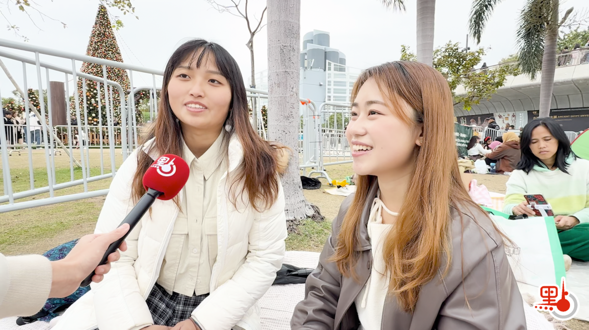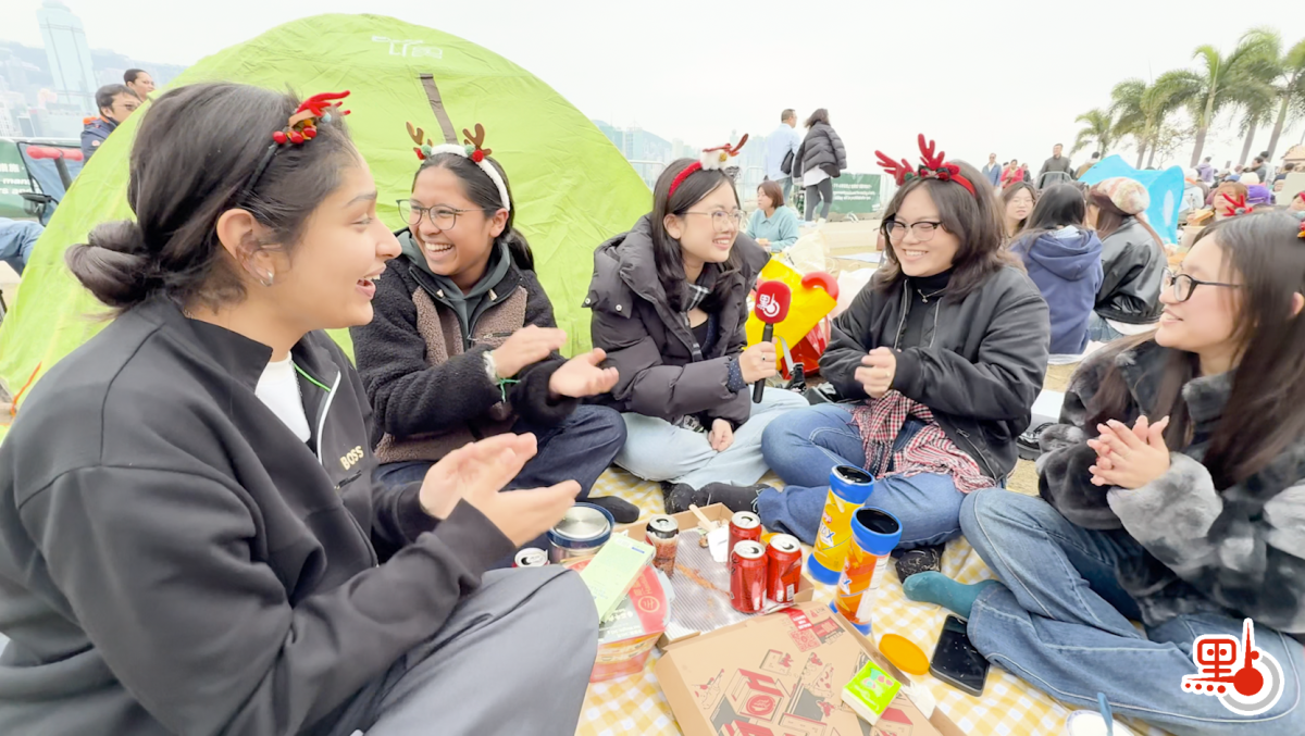 幾個中學生相約在西九文化區聖誕樹下,一邊野餐一邊交換禮物。她們大方展示自己的禮物,並大讚節日氣氛「非常棒」。「最喜歡這裏的聖誕氣氛。」Kristina說,「裝飾比以往多,而且有巨大的聖誕樹」。在香港生活超過15年的Mehak,亦很開心可以跟朋友一起慶祝。