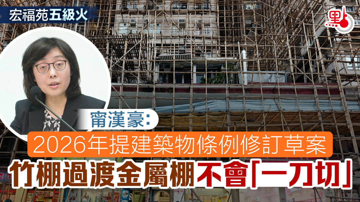 至於竹棚棚架會否「一刀切」改用金屬棚架,甯漢豪表示,發展局和建造業界有共識,將根據建築場景需要,在合適的情況下改用金屬棚架。她又指,金屬棚架的阻燃性能優於竹棚棚架,亦較竹棚更工整,對建造業前線工友的安全保障程度也更高。大埔火災後,發展局已和建造業界會面,討論將竹棚棚架過渡至金屬棚架的安排,希望明年初推出相關路線圖;待路線圖公布後,特區政府將聯同業界推出配套措施,協助竹棚師傅和承建商順利過渡。