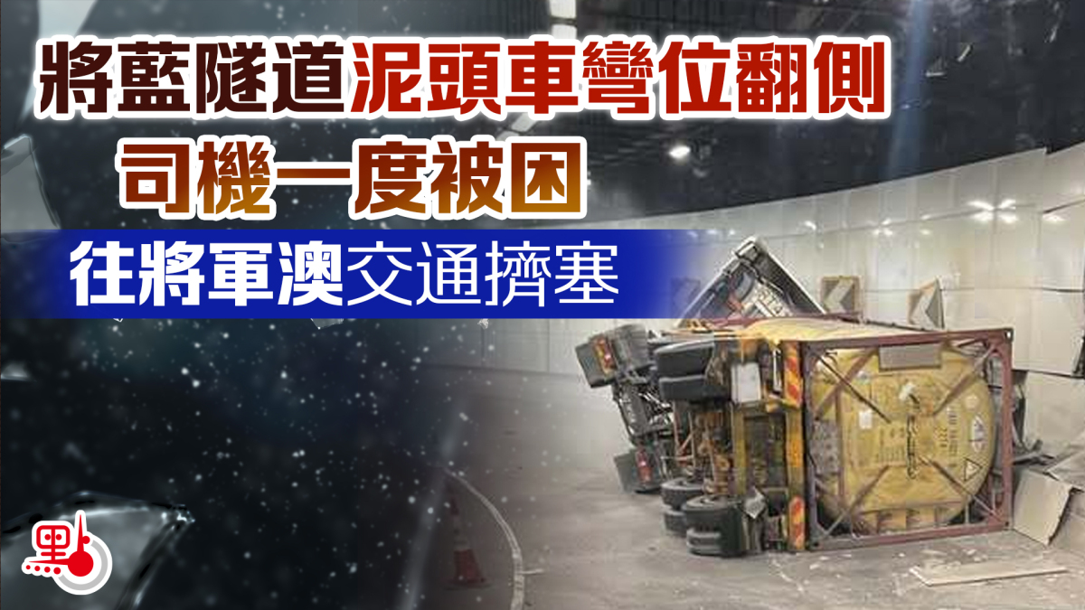 【點新聞報道】今日(27日)下午近1時,將藍隧道往將軍澳方向近隧道入口位置發生交通意外,一輛泥頭車翻側,司機一度被困,及後自行爬出,眼角擦傷。從社交平台上的圖片可見,涉事泥頭車在一處彎道位置向右翻側,撞毀隧道右邊多塊牆板,部分牆體散落。意外起因仍有待調查。