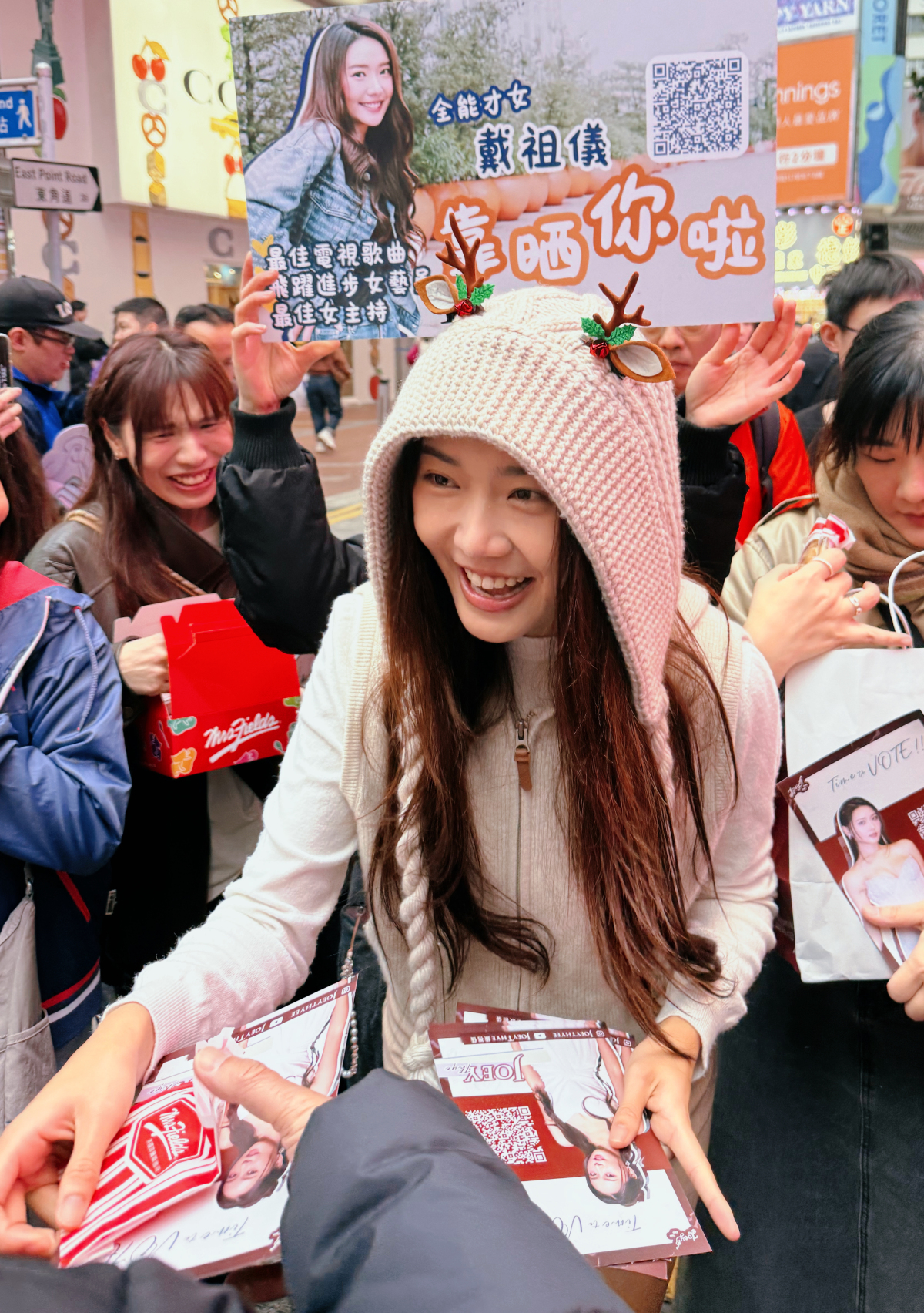 【點新聞報道】《萬千星輝頒獎典禮2025》舉行在即,戴祖儀憑劇集《刑偵12》及為綜藝節目《女神配對計劃》創作的主題曲《女神戀愛惱》,成功入圍「最佳女主持」、「最佳電視歌曲」及「飛躍進步女藝員」三項大獎十強。為爭取最後支持,她昨日(26日)現身銅鑼灣鬧市拉票,吸引大批粉絲到場打氣。