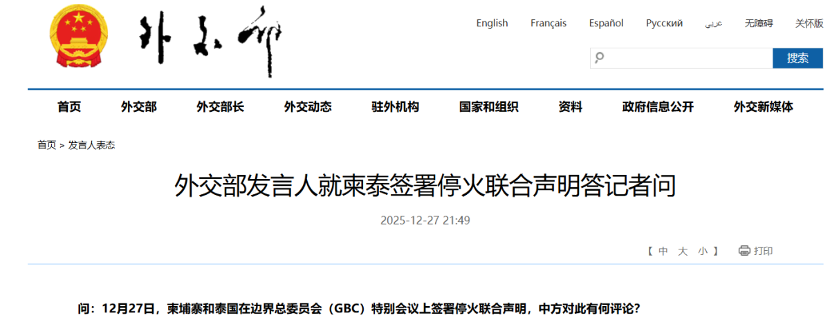 【點新聞報道】據外交部網站12月27日消息,外交部發言人就柬泰簽署停火聯合聲明答記者問。有記者問,12月27日,柬埔寨和泰國在邊界總委員會(GBC)特別會議上簽署停火聯合聲明,中方對此有何評論?