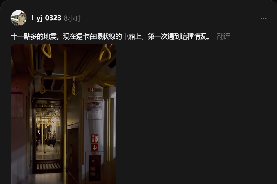 地震發生時,許多民眾搭乘捷運環狀線,因列車一度停駛,許多乘客被困在車內逾一小時,事後靠站務人員引導走軌道下車,才結束這場驚魂,直呼「第一次遇到這種況狀」、「真的太可怕」。
