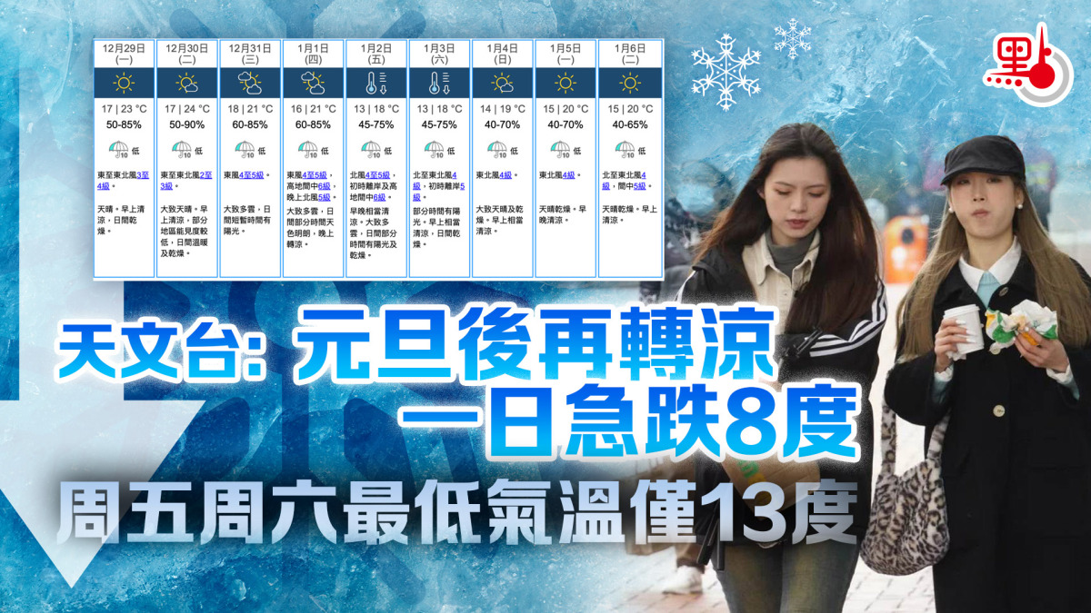 根據天文台今日九天天氣預報,周二最高氣溫可回升至24度,周三除夕氣溫約18至21度。元旦日過後,天氣會顯著轉涼,周五(1月2日)早晚相當清涼,大致多雲,氣溫會跌至最低13度,比元旦日最高氣溫急跌8度,周六同樣最低氣溫只有13度。