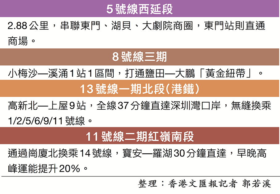港鐵稱,13號線一期北段起自高新北站,終至上屋站,包含9站8區間(西麗高鐵站暫未開通),開通後可大幅提升沿線居民的出行通勤效率。其中,上屋到深圳灣口岸的通行時間將縮短至37分鐘。13號線一期南段(深圳灣口岸站至高新中站)已於2024年12月28日投入運營。13號線一期貫通後,與地鐵1、2、5、6、9、11號線等線路換乘,對滿足沿線區域交通需求,提升市民出行效率,便利深港兩地人員往來,對進一步深化深港兩地及粵港澳大灣區互聯互通有着重要意義。