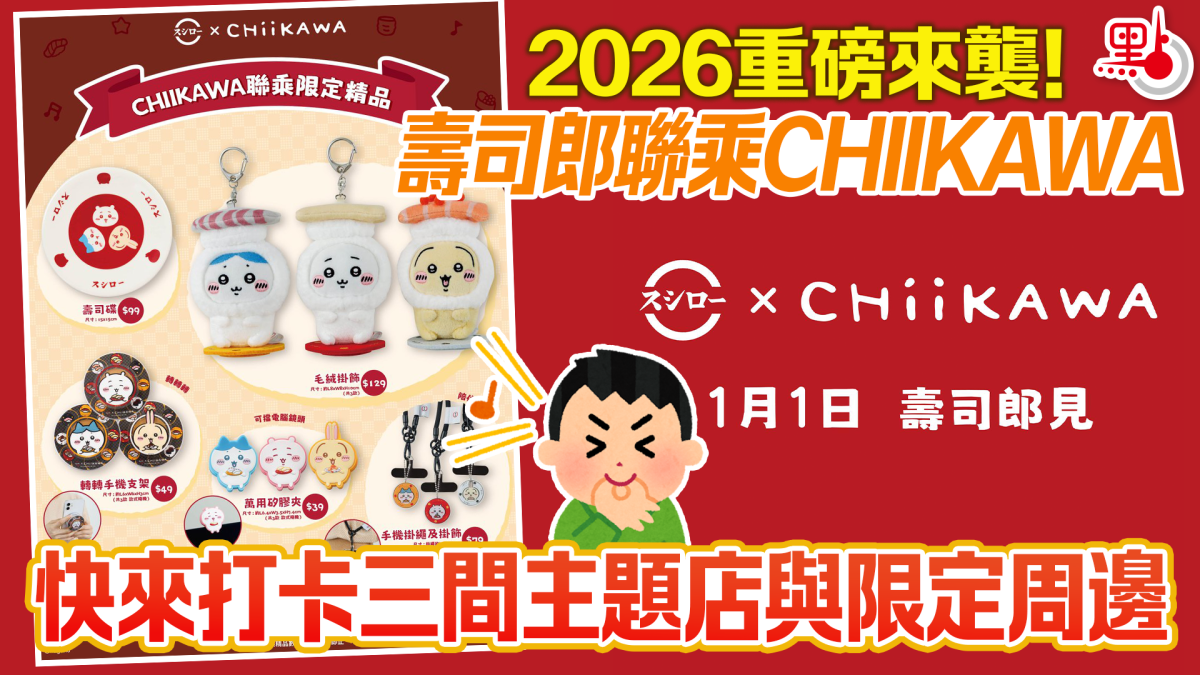 【點新聞報道】注意啦!本港壽司郎重磅宣布將在2026年1月1日起與《CHIIKAWA》攜手合作,陪你迎接新的一年!此次聯乘活動除了1月限定Menu,更推出一系列限定版周邊,堂食或外賣消費滿指定金額,最低僅需加$39即可換購。