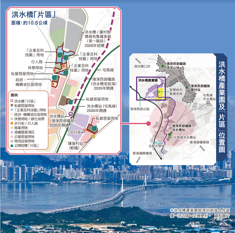 特區政府去年提出試行「片區開發」模式,揀選「洪水橋 / 廈村新發展區」、「粉嶺北新發展區」及「新田科技城」3個試點區。昨日宣布首先公開招標的洪水橋「片區」,總面積約11公頃,包括三幅住宅用地及三幅「企業及科技園」用地,合共提供約15.6萬平方米住宅樓面面積,以及約28萬平方米的產業樓面面積。