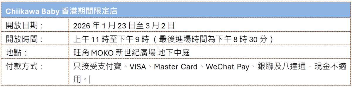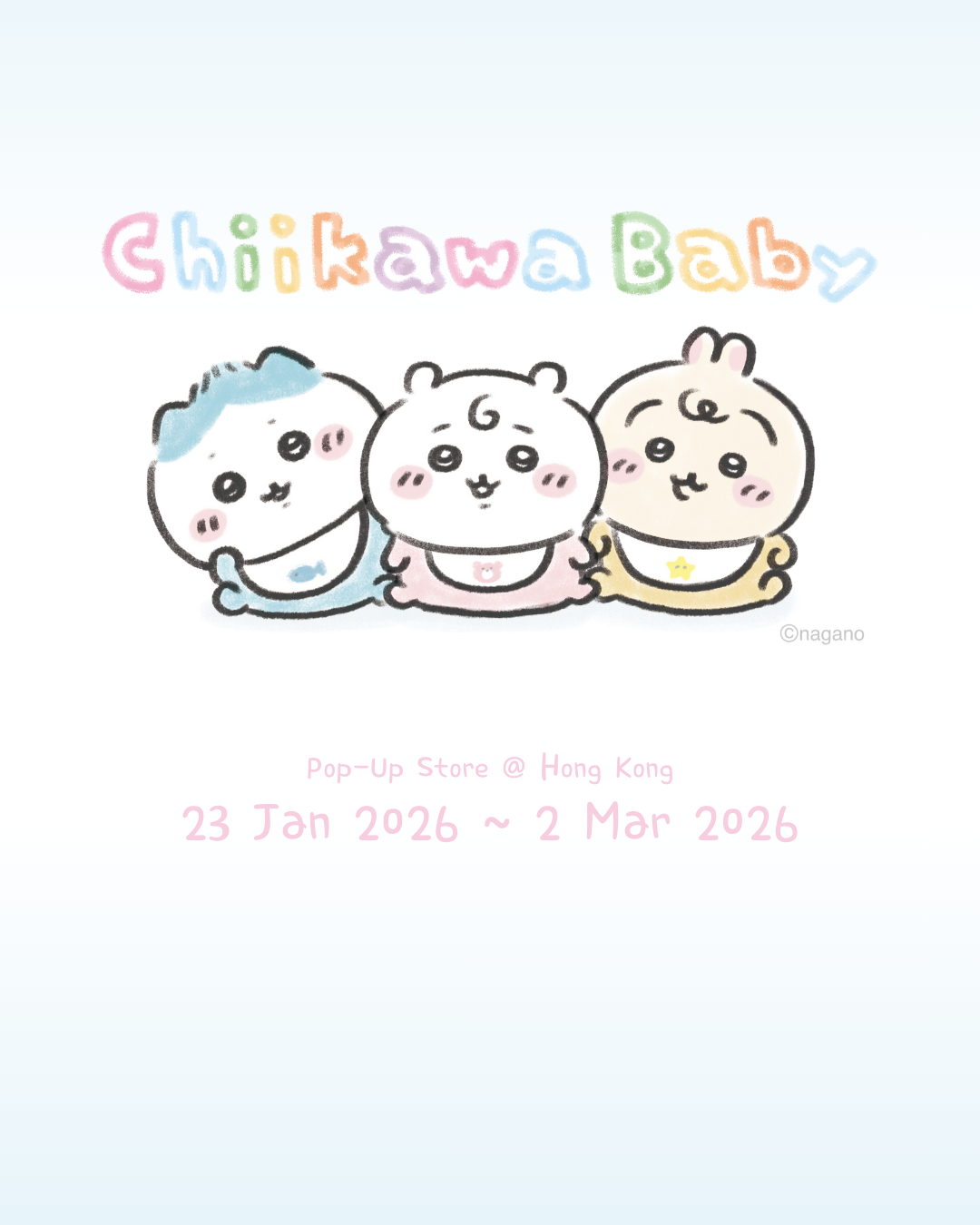 佔地近2,000呎的日本授權Chiikawa Baby香港期間限定店,為香港粉絲帶來多款日本直送主題商品,除了帶來全員變身可愛寶寶造型公仔外,亦有一系列兼具可愛及實用的生活雜貨,一站式滿足每位粉絲的收藏之心;更令人期待必然是1月23日有全新Chiikawa Baby第2彈新品,勢必掀起全城熱話!