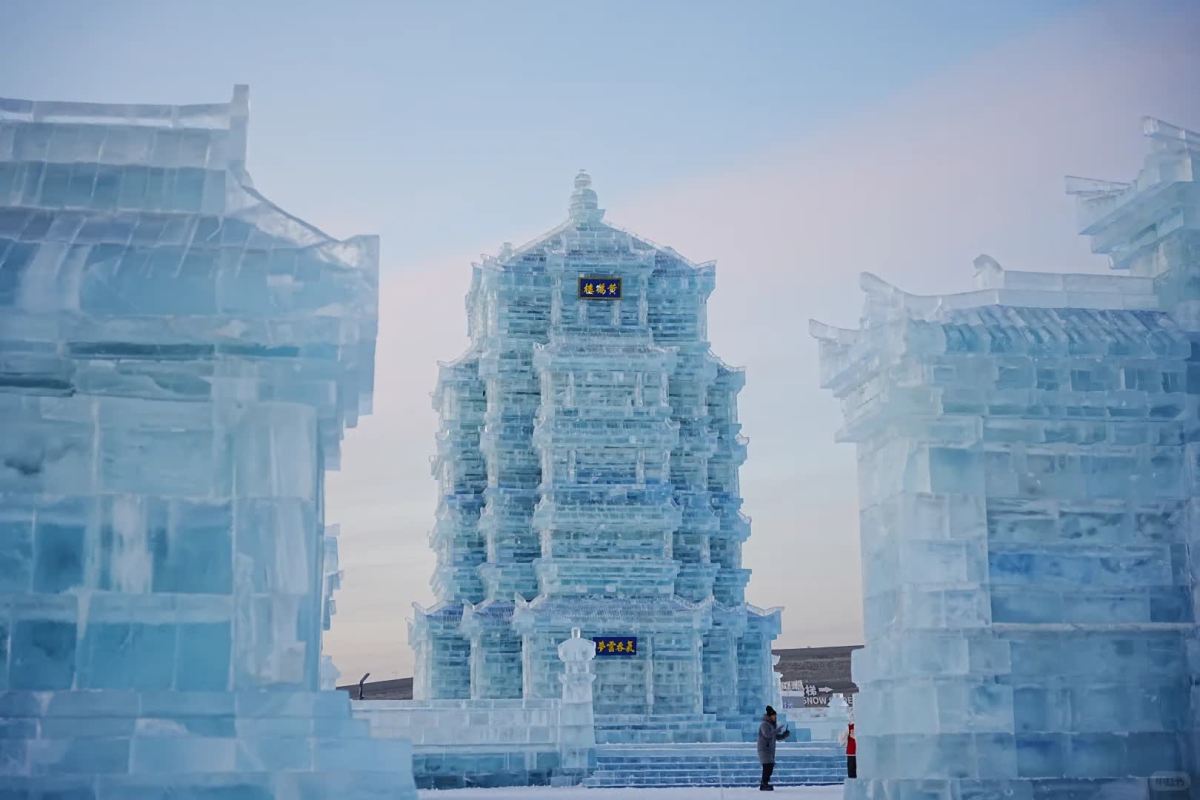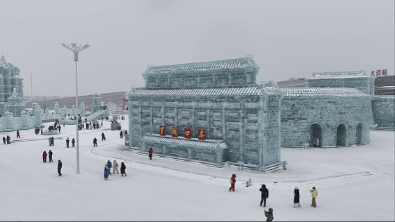 作品總計用冰約2450立方米,高14米、寬26.5米,由哈爾濱冰雕團隊精細雕琢而成。