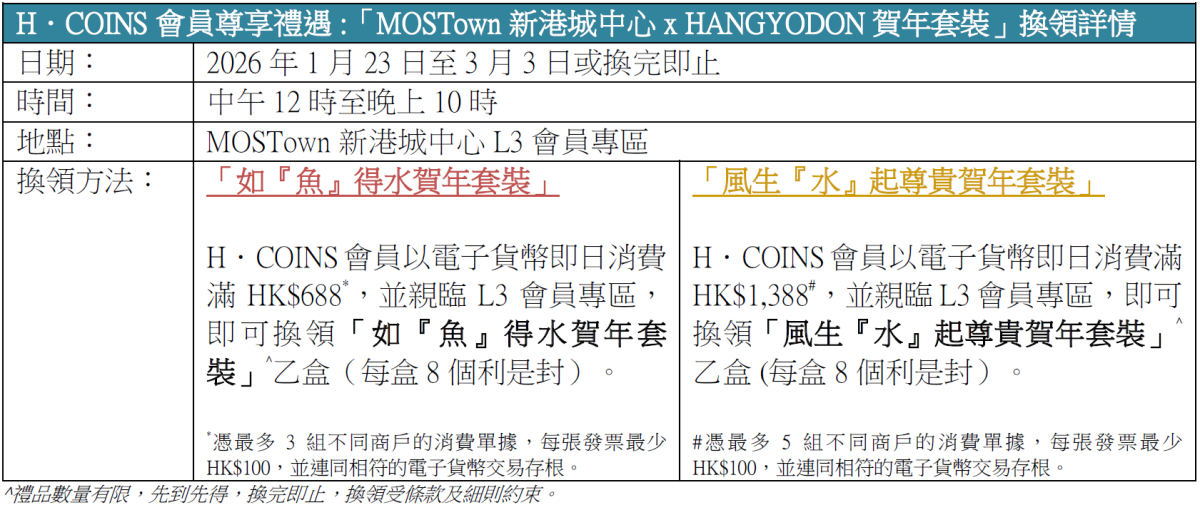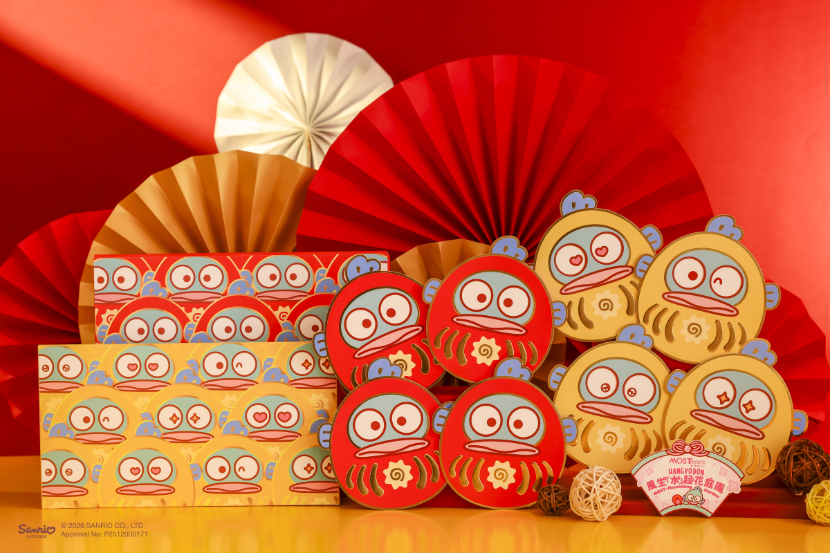 MOSTown新港城中心將首度聯乘Sanrio人氣角色HANGYODON,呈獻全港首次亮相的新春限定主題商場裝置「風生『水』起花庭園」,獨家推出兩款限量別注版利是封套裝:「如『魚』得水賀年套裝」及「風生『水』起尊貴賀年套裝」(各每盒8個利是封)。各利是封內頁更印有期間限定商戶禮遇二維碼,大家只需用手機輕鬆掃瞄,即有機會獲取商戶新春優惠,盡享商場內的餐飲及潮流生活等消費樂趣,齊齊豐衣足食迎新歲!